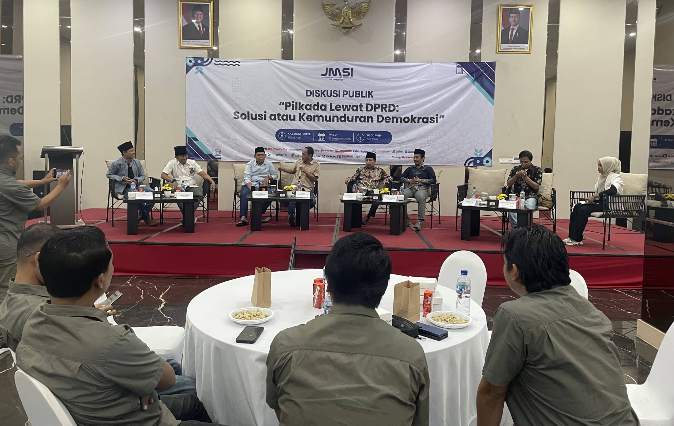 asatoe.co, Sumenep – Jaringan Media Siber Indonesia (JMSI) Kabupaten Sumenep menggelar diskusi publik bertajuk “Pilkada Lewat DPRD: Solusi atau Kemunduran Demokrasi” di Hotel Kaberaz, Sumenep, Rabu (21/1/2026).