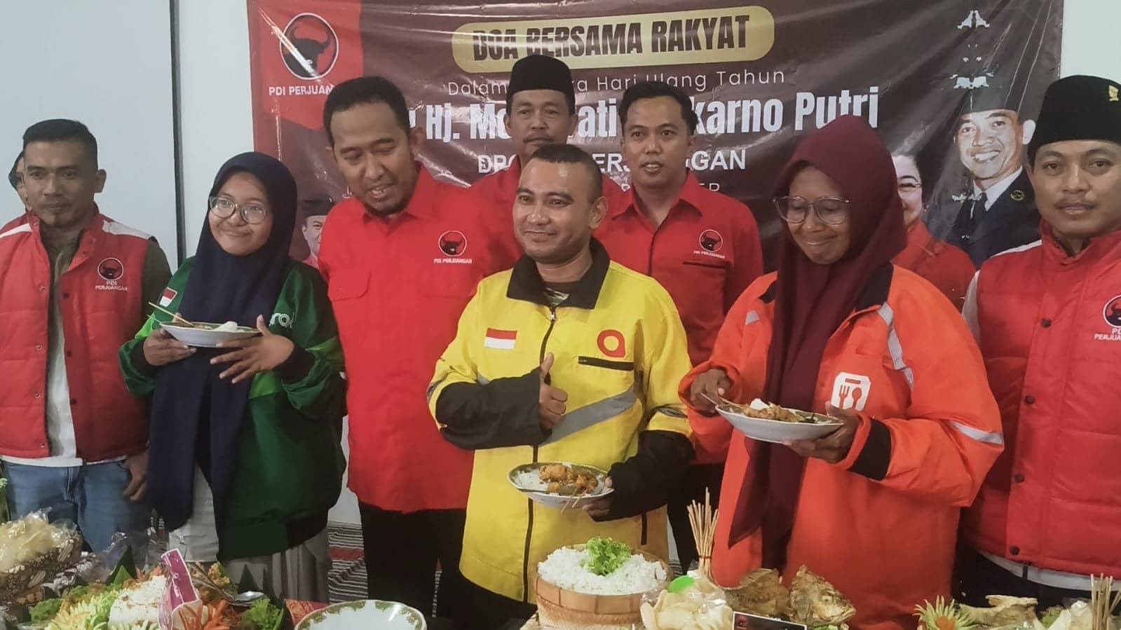 Setelah itu, acara diisi dengan pemotongan tumpeng, doa bersama, dan makan bersama antara pengurus partai dan puluhan driver ojol yang hadir.